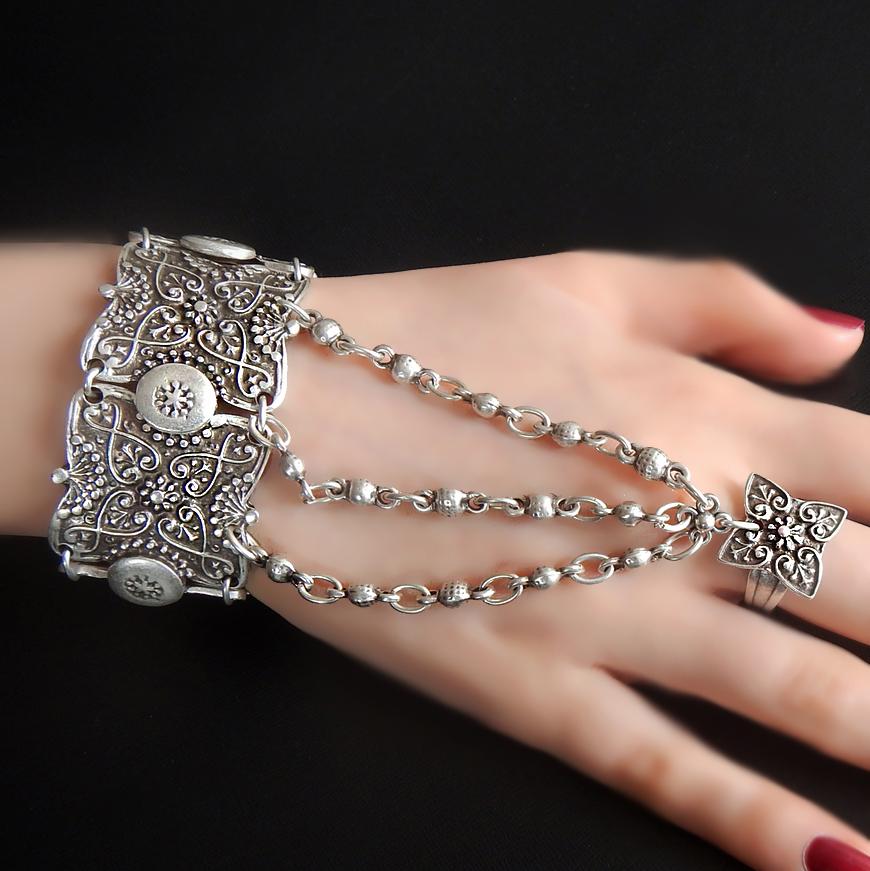 Unleash your inner harem girl with our exotic Harem cuff! An elaborately etched cuff bracelet is connected to a lovely four point flower-shaped ring with three beaded chains for plenty of antique flavor. One size fits all with adjustable ring and hook and loop chain closure bracelet.