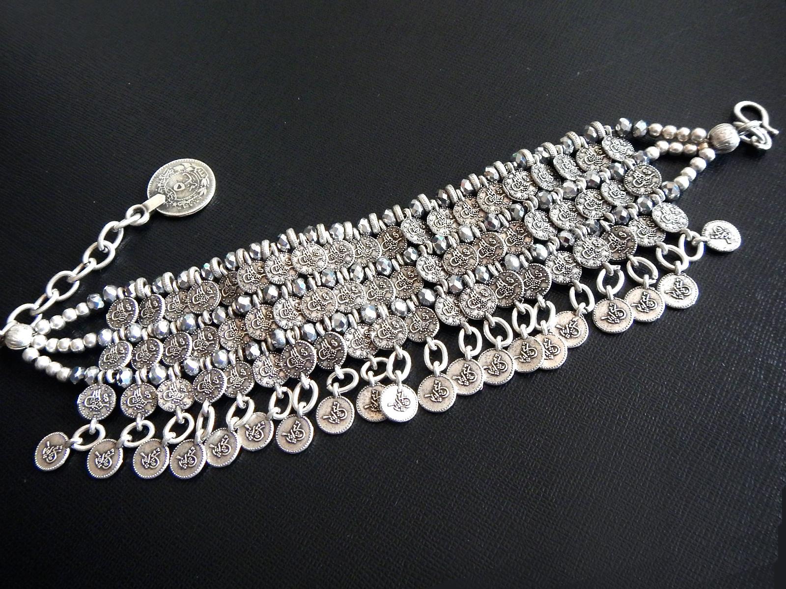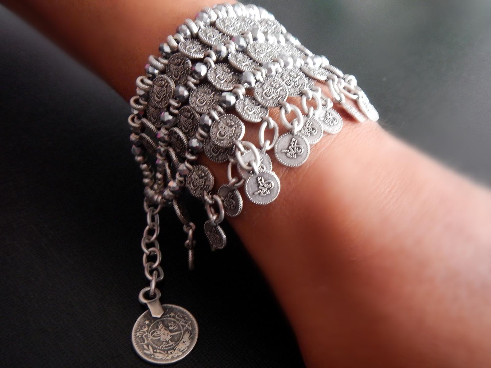 Boho - chic silver plated bracelet with Swarovski crystals. One size fits all. . Silver-plated with simple hook and loop closure, one size fits all.