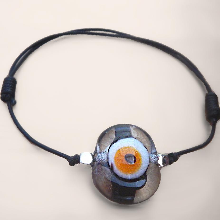 The traditional Turkish Nazar or "evil eye" is believed to transform negative energy and offer protection from envy. Our Nazar Basic bracelets feature a hand-blown translucent glass Nazar bead strung on viscose thread and accented with silver-plated beads. One-size-fits-all with adjustable slip closure, available in green and black.