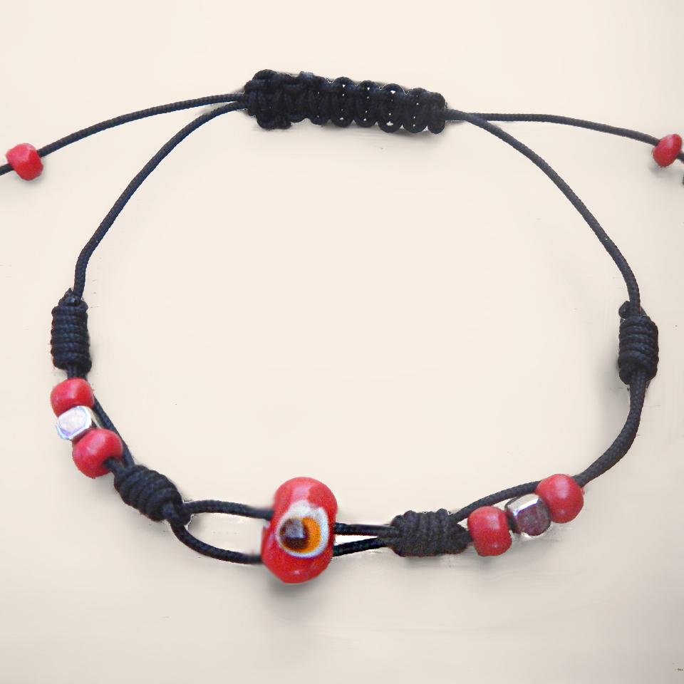 The traditional Turkish Nazar or "evil eye" is believed to transform negative energy and offer protection from envy. Our Nazar Mini bracelets features a red hand-blown glass Nazar bead strung on viscose thread and accented with red and silver glass beads. One-size-fits-all with adjustable slip closure.
