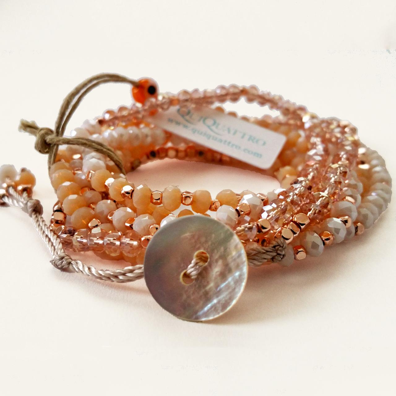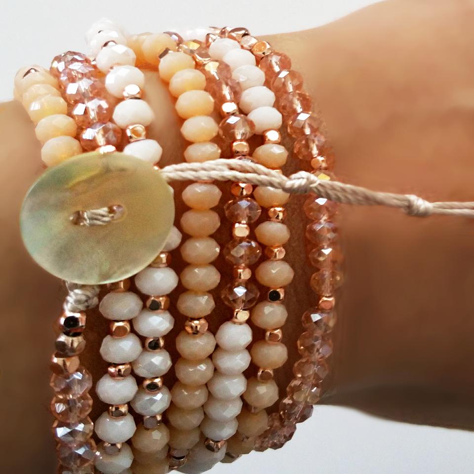 Like all our Magiclets, this piece is made exclusively of Swarovski crystal beads and silver-plated accents with a Mother of Pearl button closure. Blush features shades of light pink, blush rose, and cream.