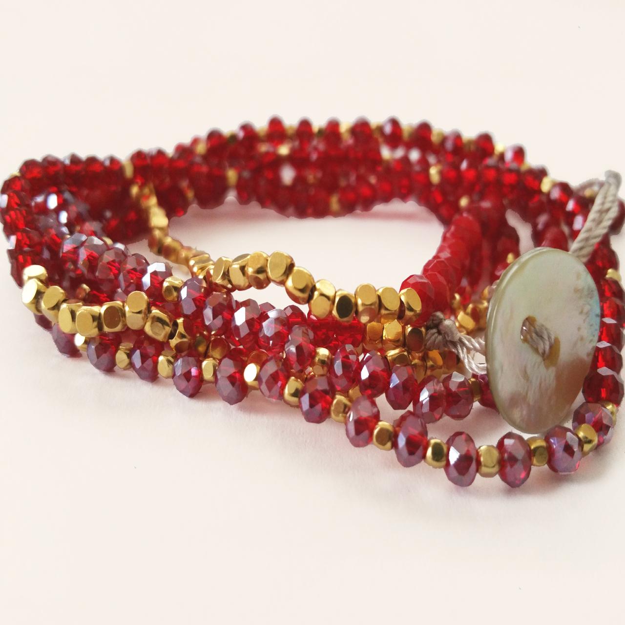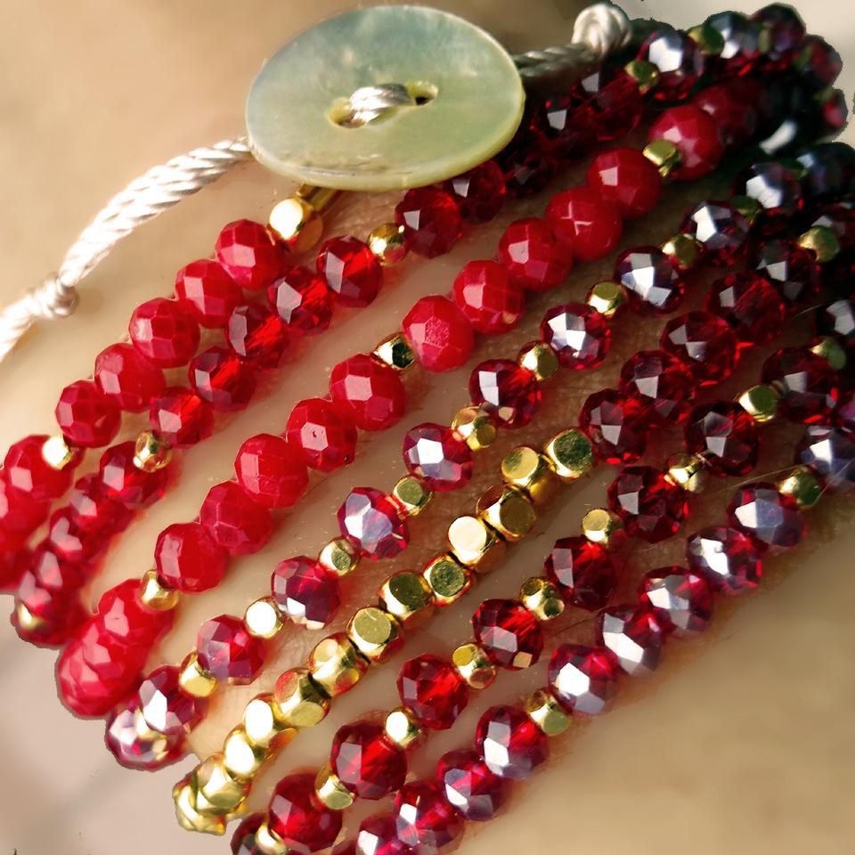 Like all our Magiclets, this piece is made exclusively of Swarovski crystal beads and silver-plated accents with a Mother of Pearl button closure. Garnet features shades of red, gold, and gunmetal.