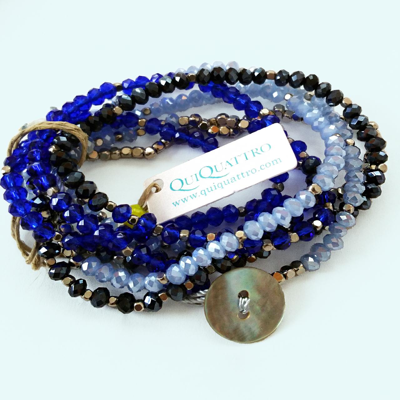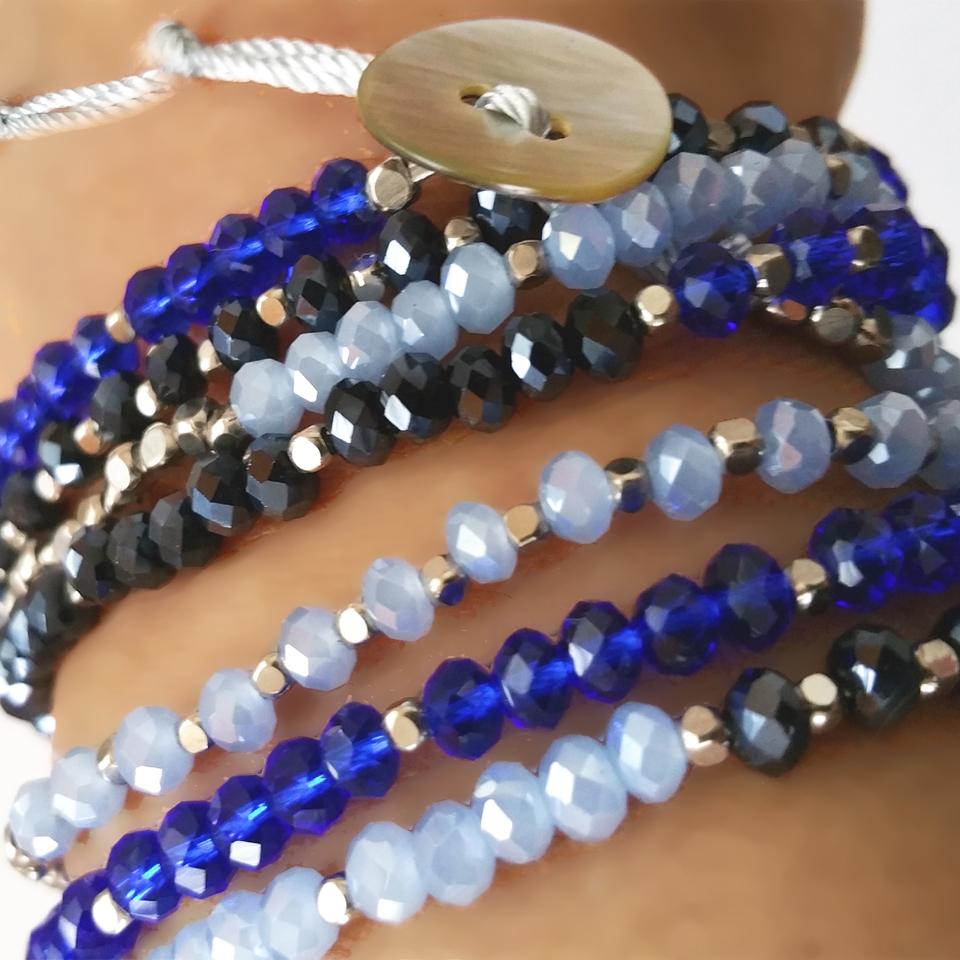 Like all our Magiclets, this piece is made exclusively of Swarovski crystal beads and silver-plated accents with a Mother of Pearl button closure. Sapphire features shades of dark blue, light blue, and navy.