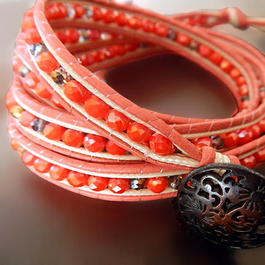 The Fire Wide Magiclet features bright orange and metallic Swarovski crystal beads woven between coral and tan leather cordon. Finished with a silver-plated detailed cut-out button.