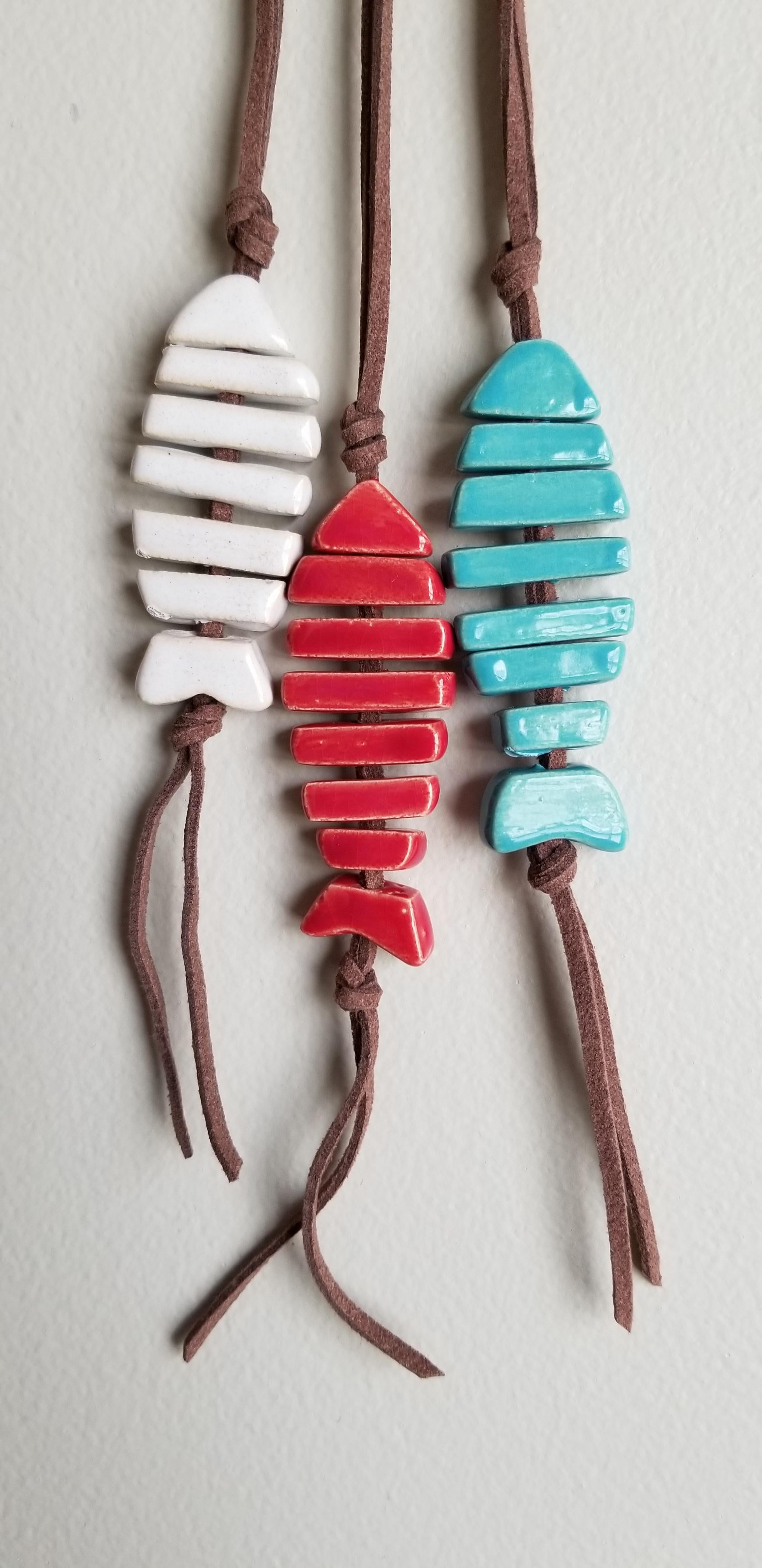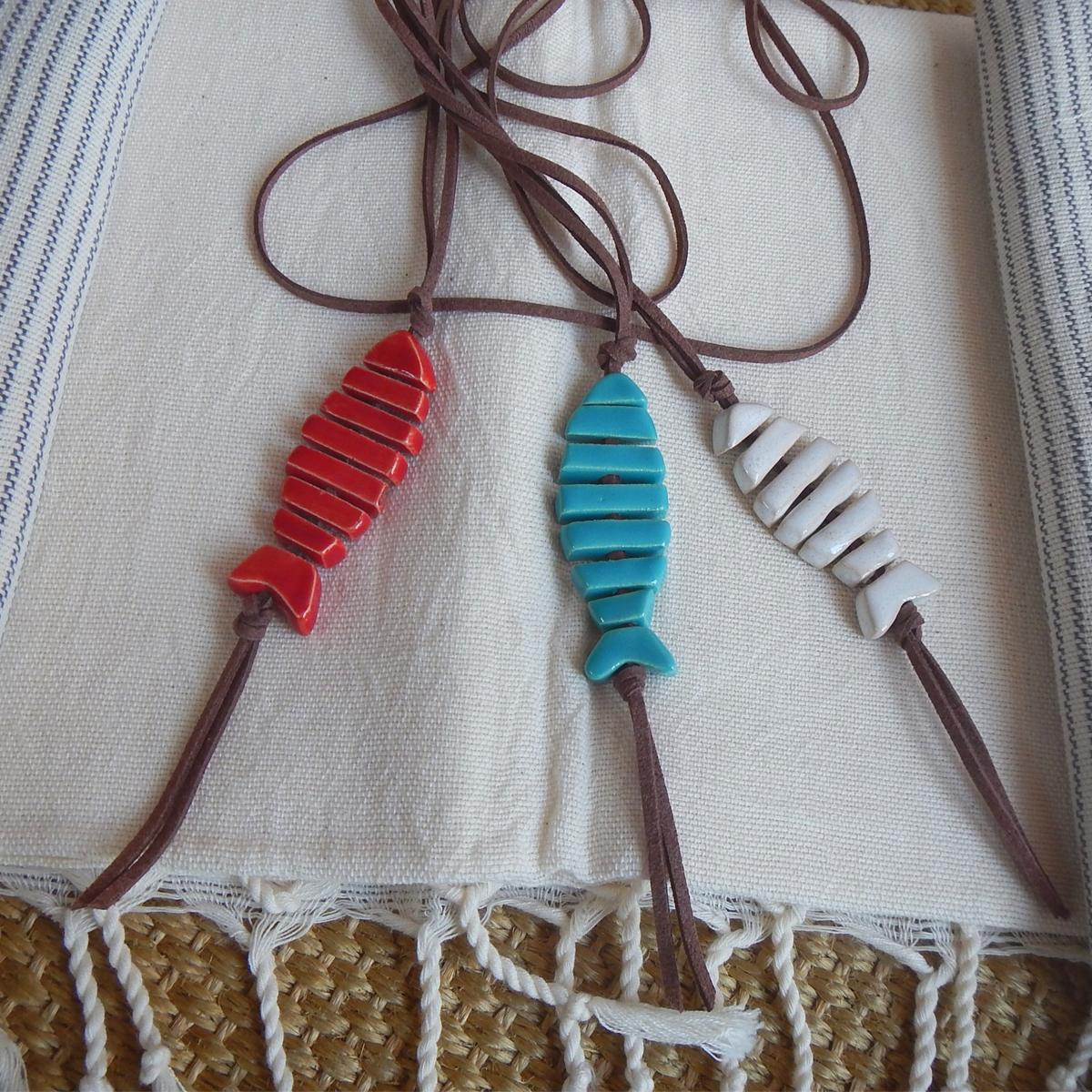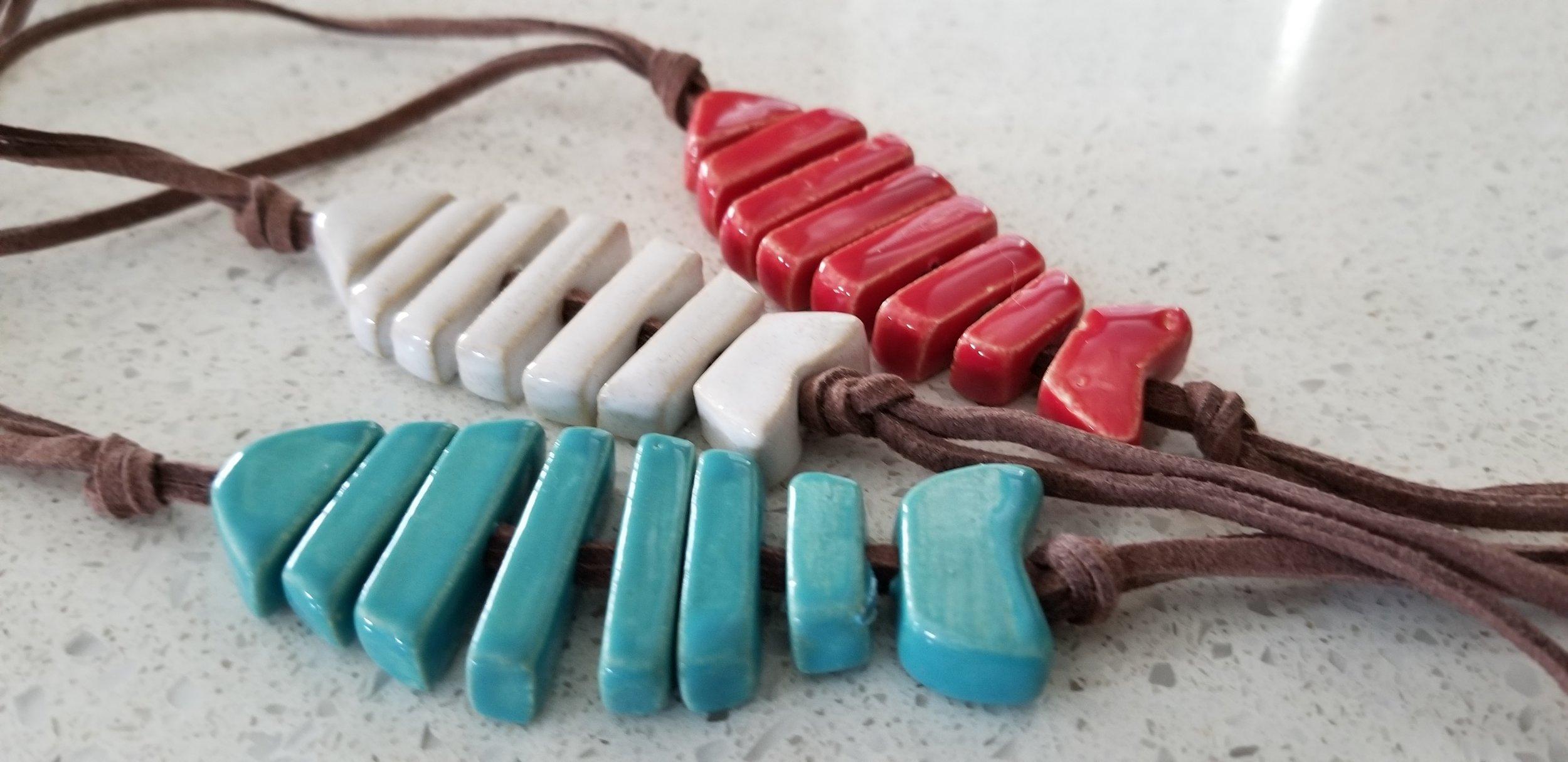 Hermosa is an elegant and minimalist necklace. All pieces made by hand and glazed, it is unique and each necklace will be slightly different from each other. Comes in three colors Cream, Red and Turquoise . 22 inches long. Like the name those pieces are just beautiful, and delightful to wear. This necklace remind you being on vacation forever.