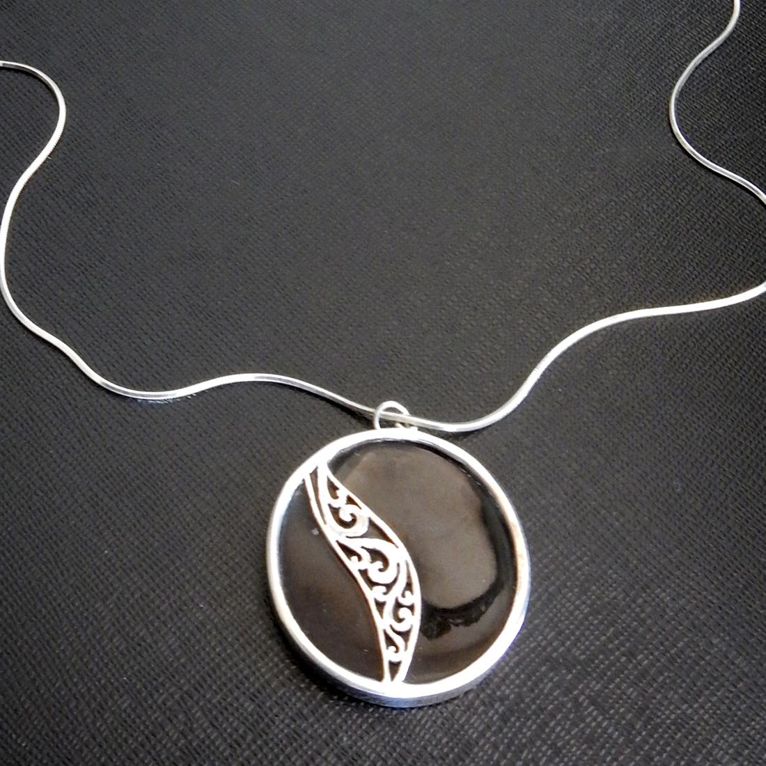 A delicate silver necklace chain with an elegant polished black stone pendant in a silver setting. 925 sterling silver, available in short and long chain length.