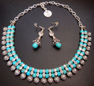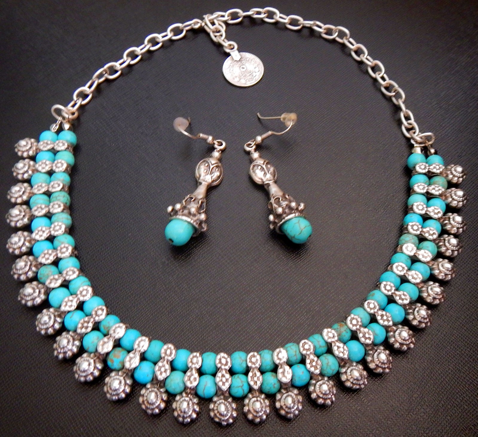 Rows of silver-plated flower shaped beads connect to form a dynamic chain topped with dainty turquoise beads and earrings. Beautiful trendy summer jewelry.