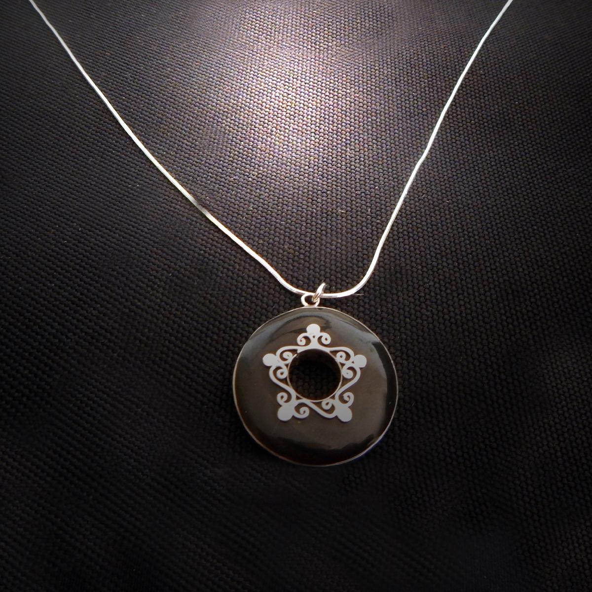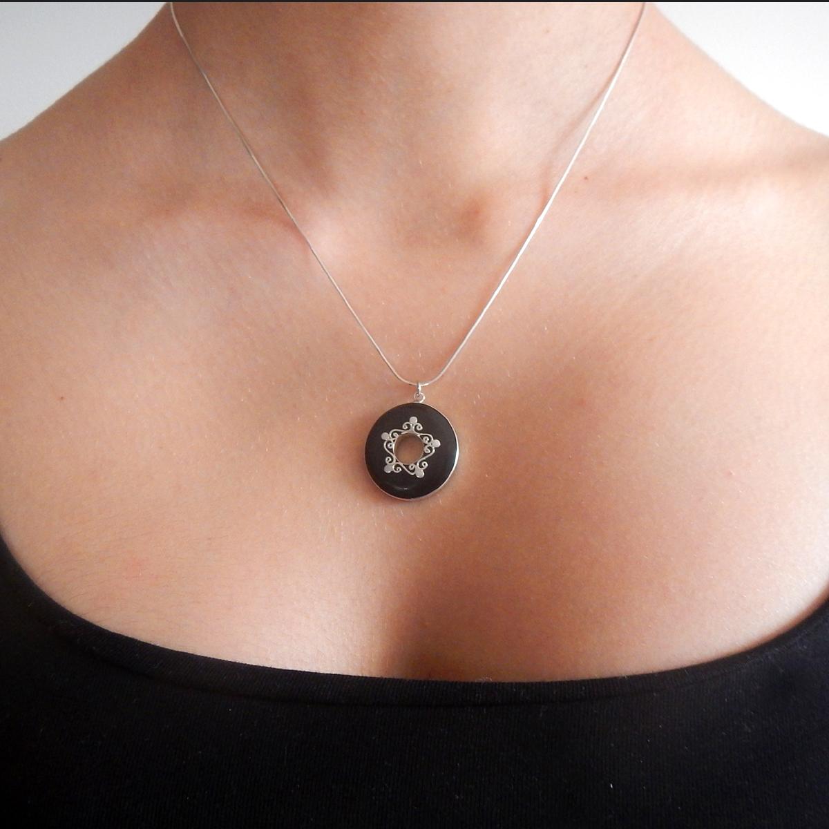 Harness the power of onyx, which is believed to protect it's wearer and transform negative energy! Our Black Flower necklace features a polished onyx stone etched with silver scroll design and hangs from a modern silver rope chain.