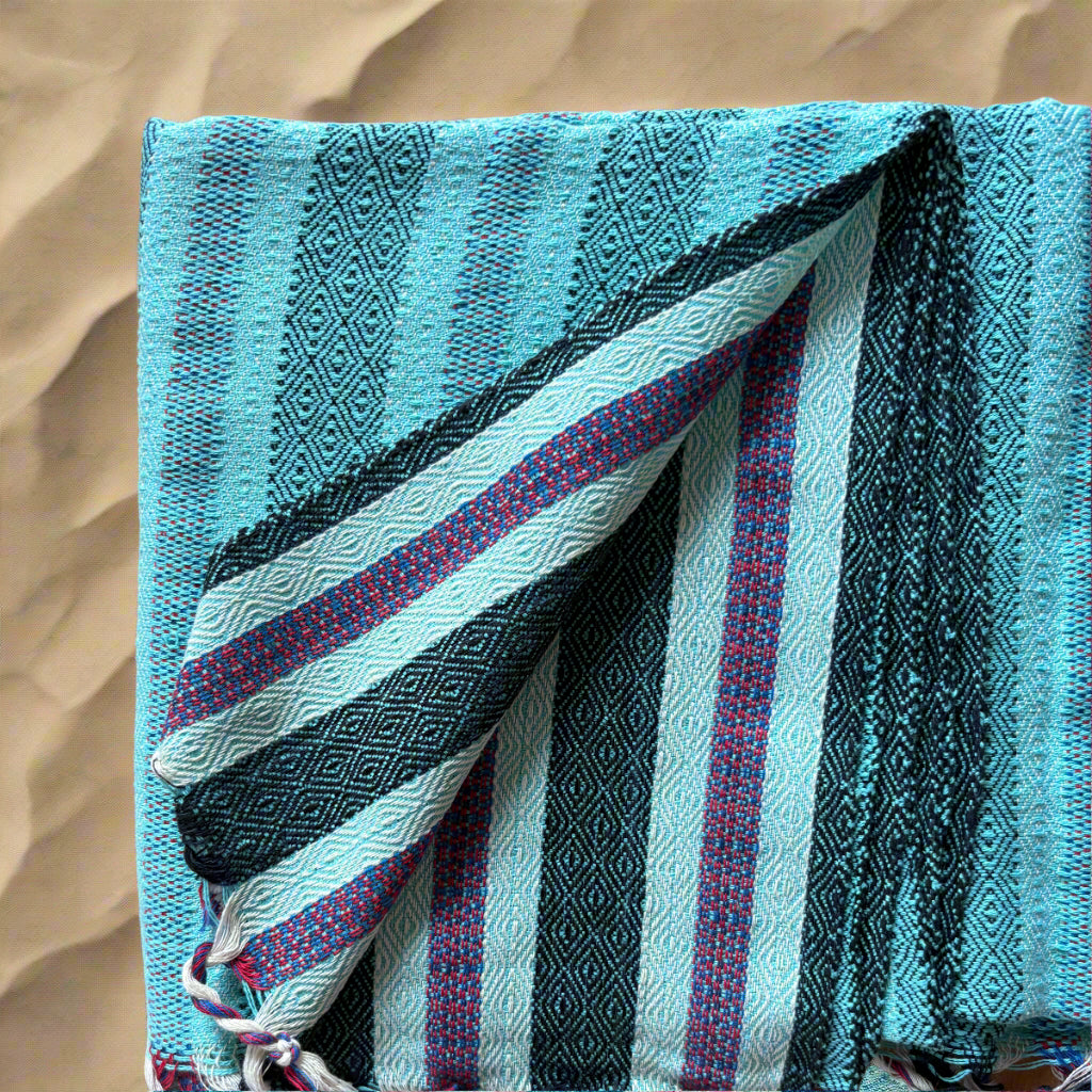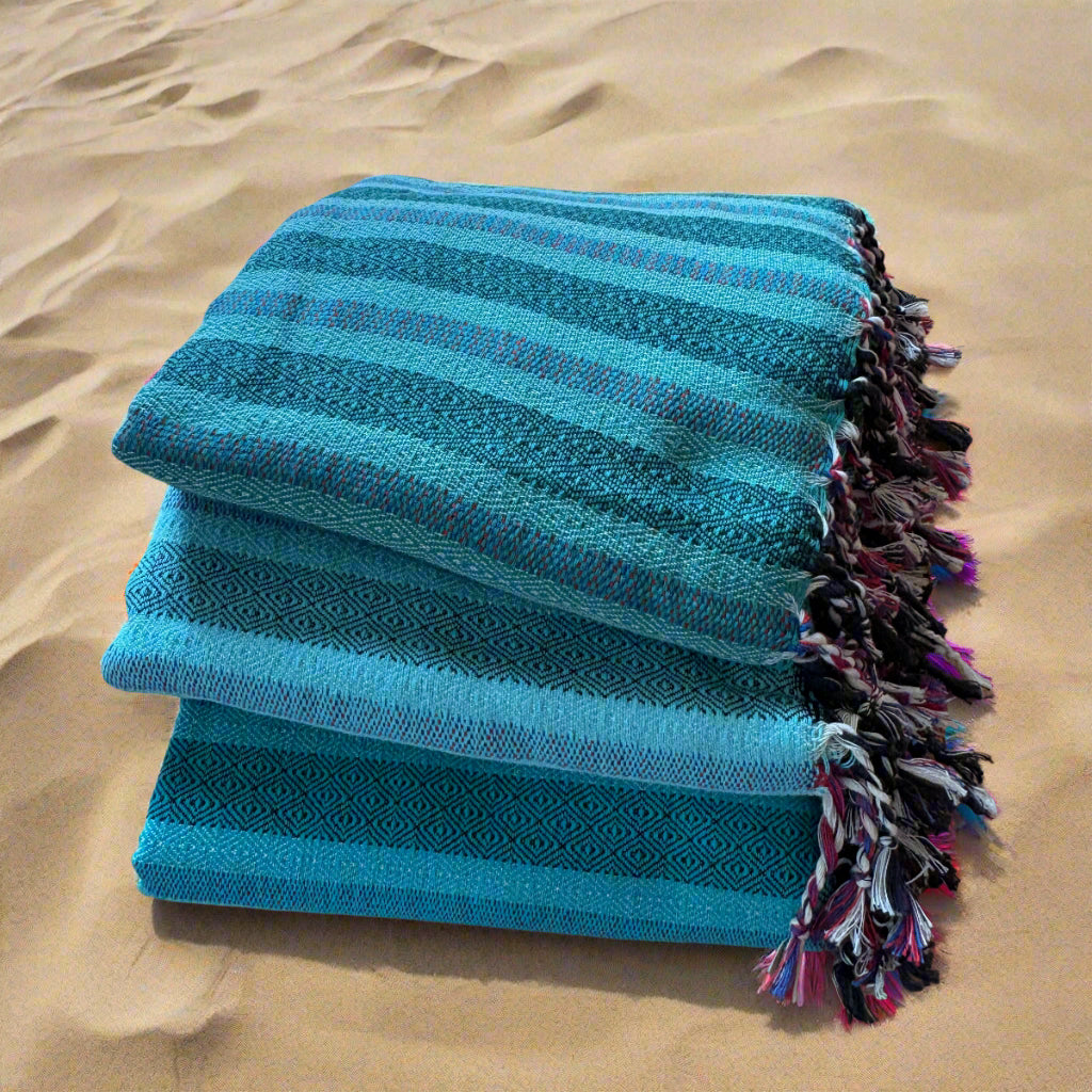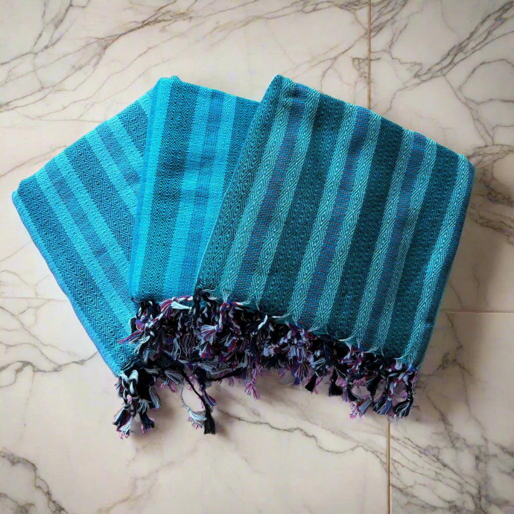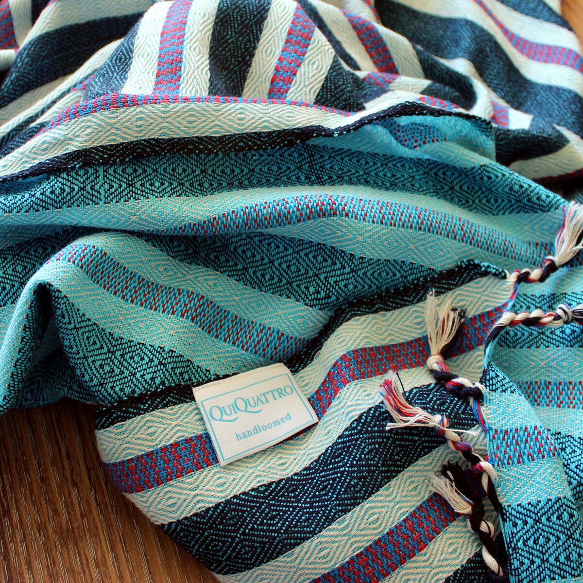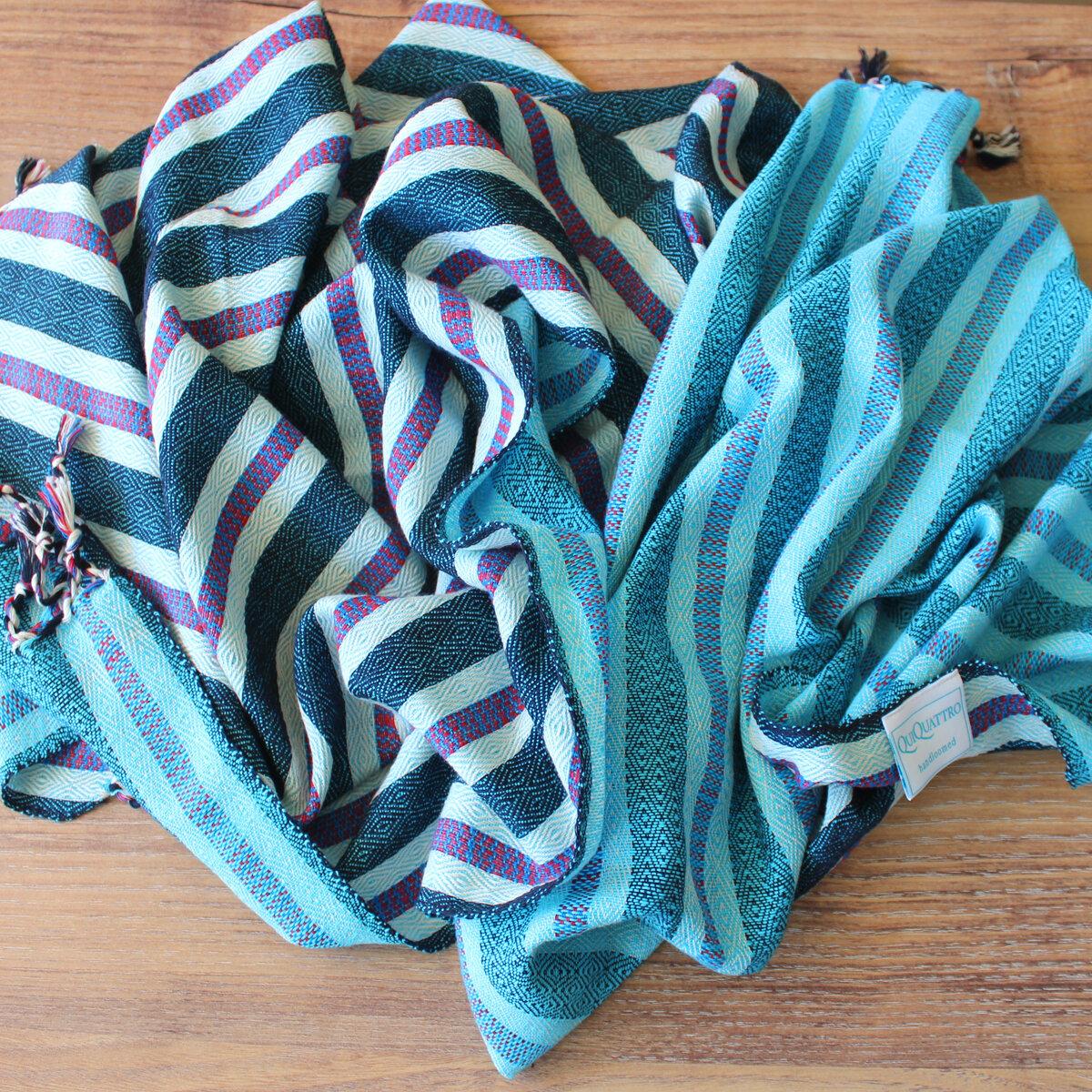 BACK IN STOCK. with two other colors. Now we have dark blue, light blue. and green QuiQuattro exclusive. Blue magic Turkish towel is hand loomed on old looming machines by artisans. Each piece is unique and crafted with love. It is loomed with 100 % Turkish cotton. The looming on this towel is very special, it is a reversible with one side blue and the other side is totally different. Soft to the touch and absorbent like all of our towels.