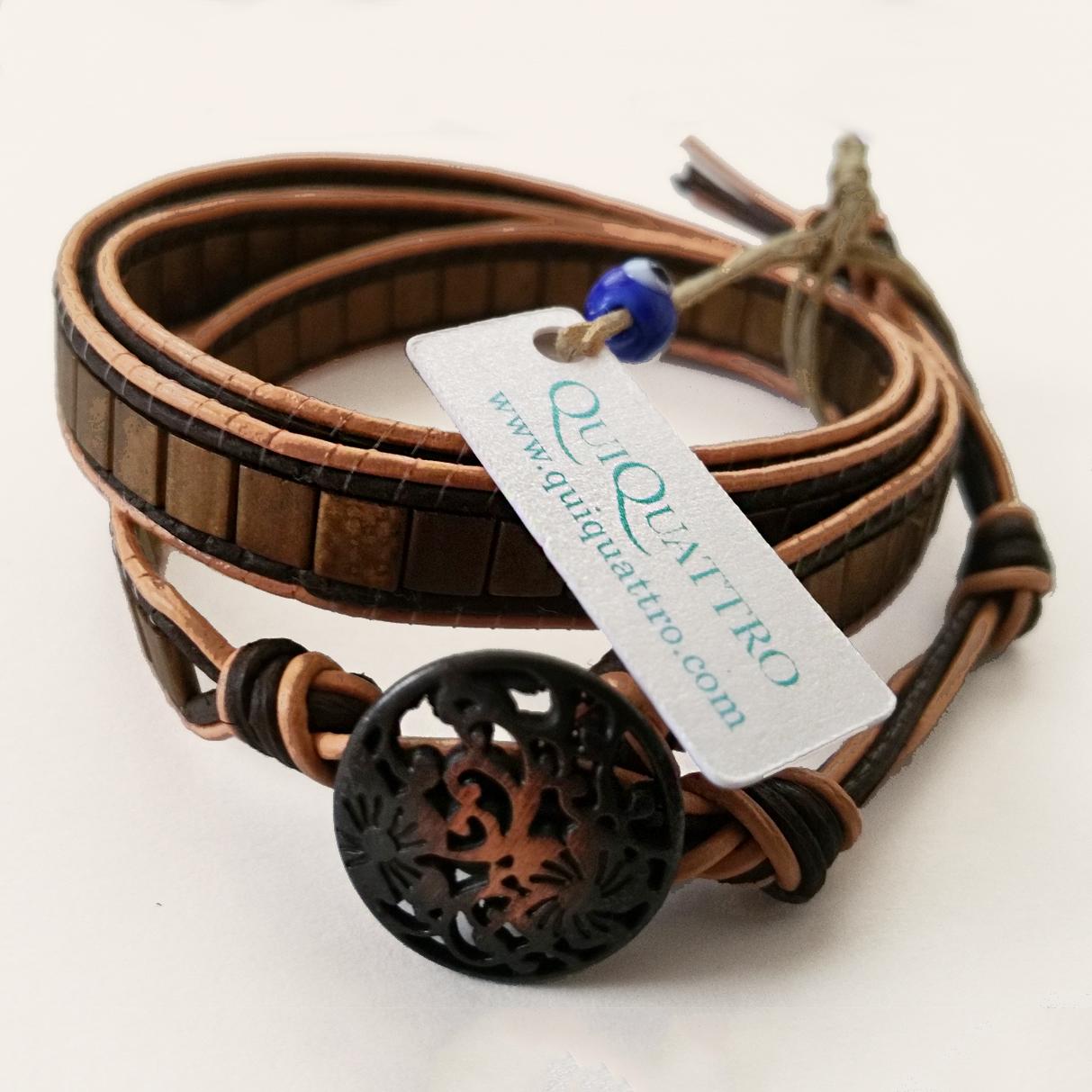 The Bronze Wide Magiclet features square Miyuki shoji beads bordered with brown leather cordon and finished off with detailed cut-out button.