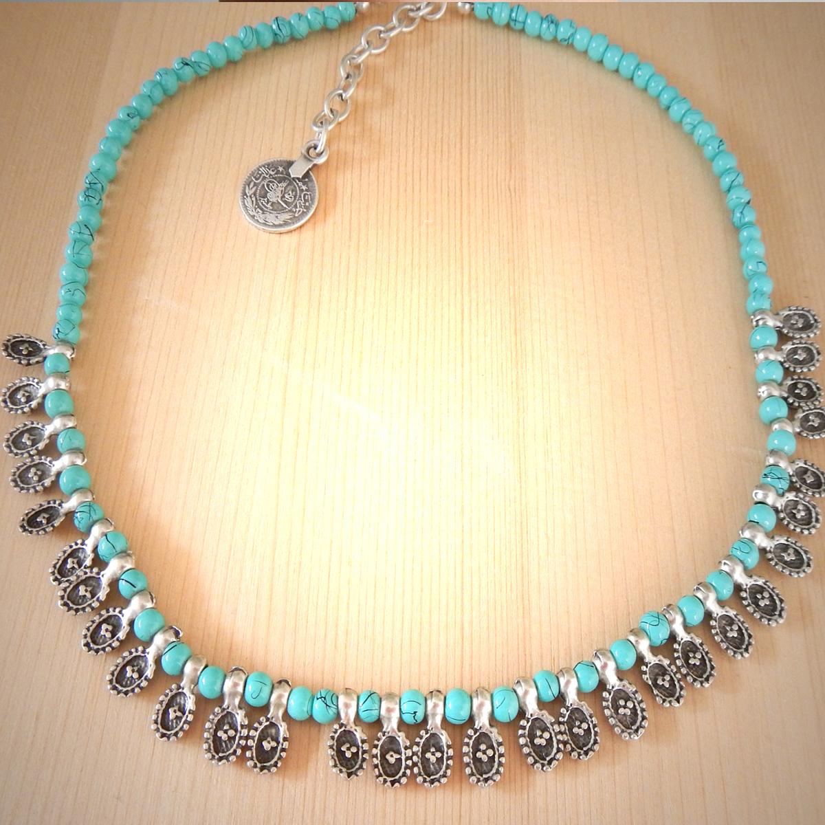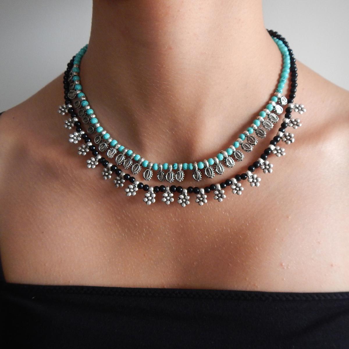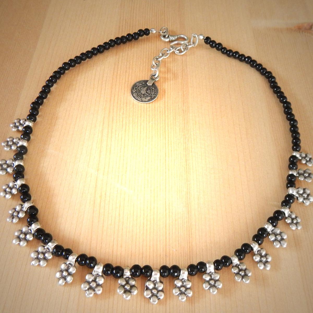 Flowers in Line features a row of miniature silver-plated flower pendants lined with faux onyx beads, measures approximately 8.5" long with hook and loop closure. Makes a perfect companion to our Orion Necklace!