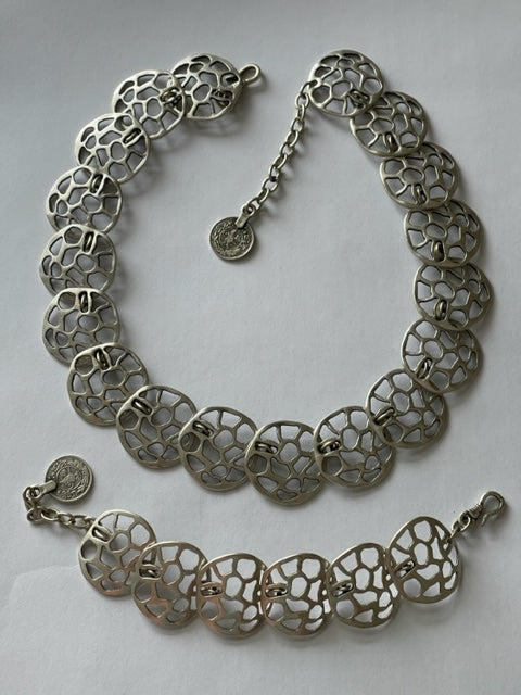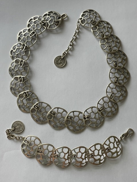 Delicate lace like disks connect to form a elegant and graceful necklace and bracelet. Beautiful trendy summer jewelry. Made in turkey Silver plated. Does not tarnish.