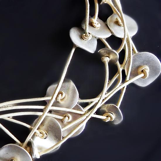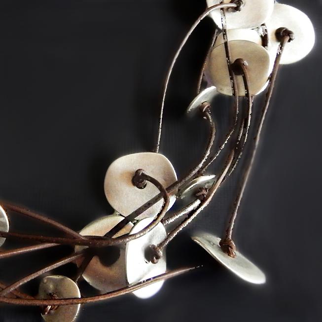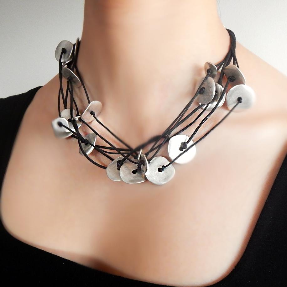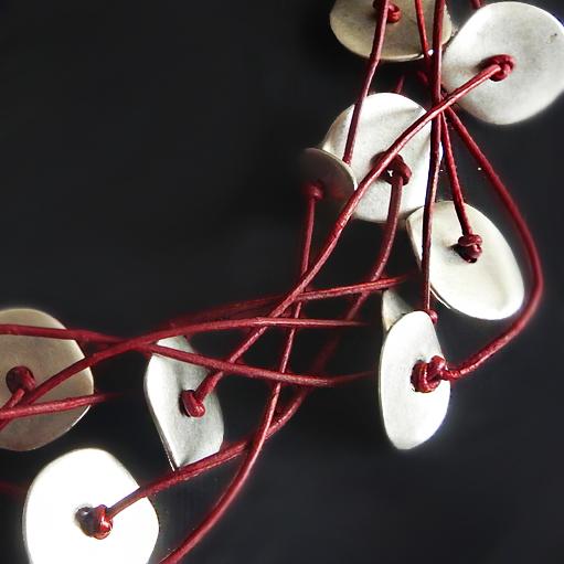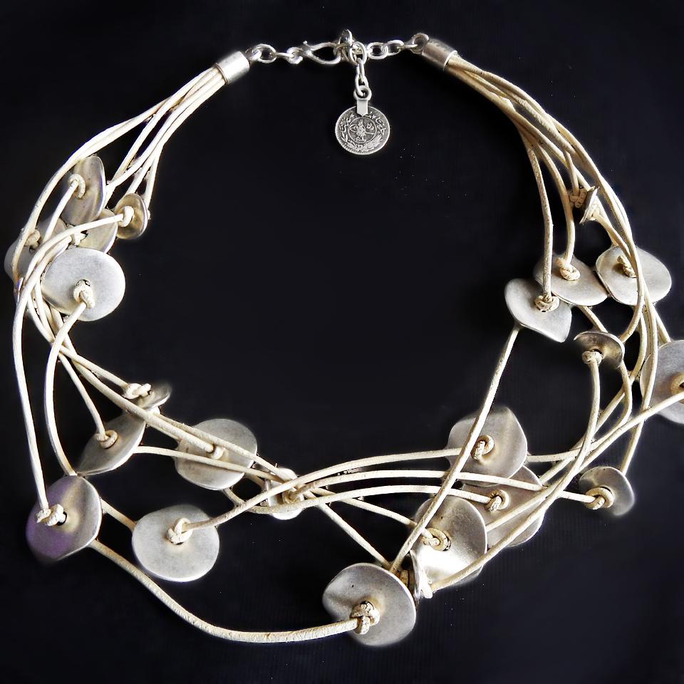 Our Hera necklace is a playful piece that's effortlessly cool. With silver-plated discs hand-strung on leather cordon. Available in black, white, red or brown.