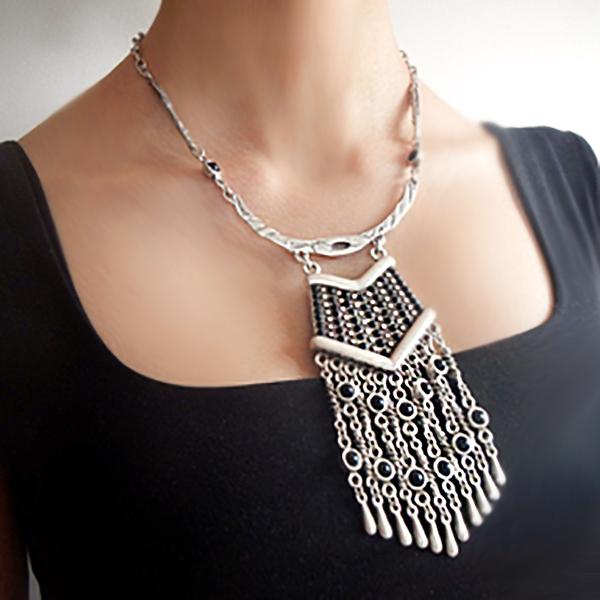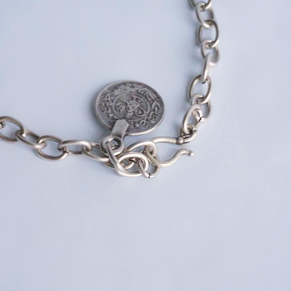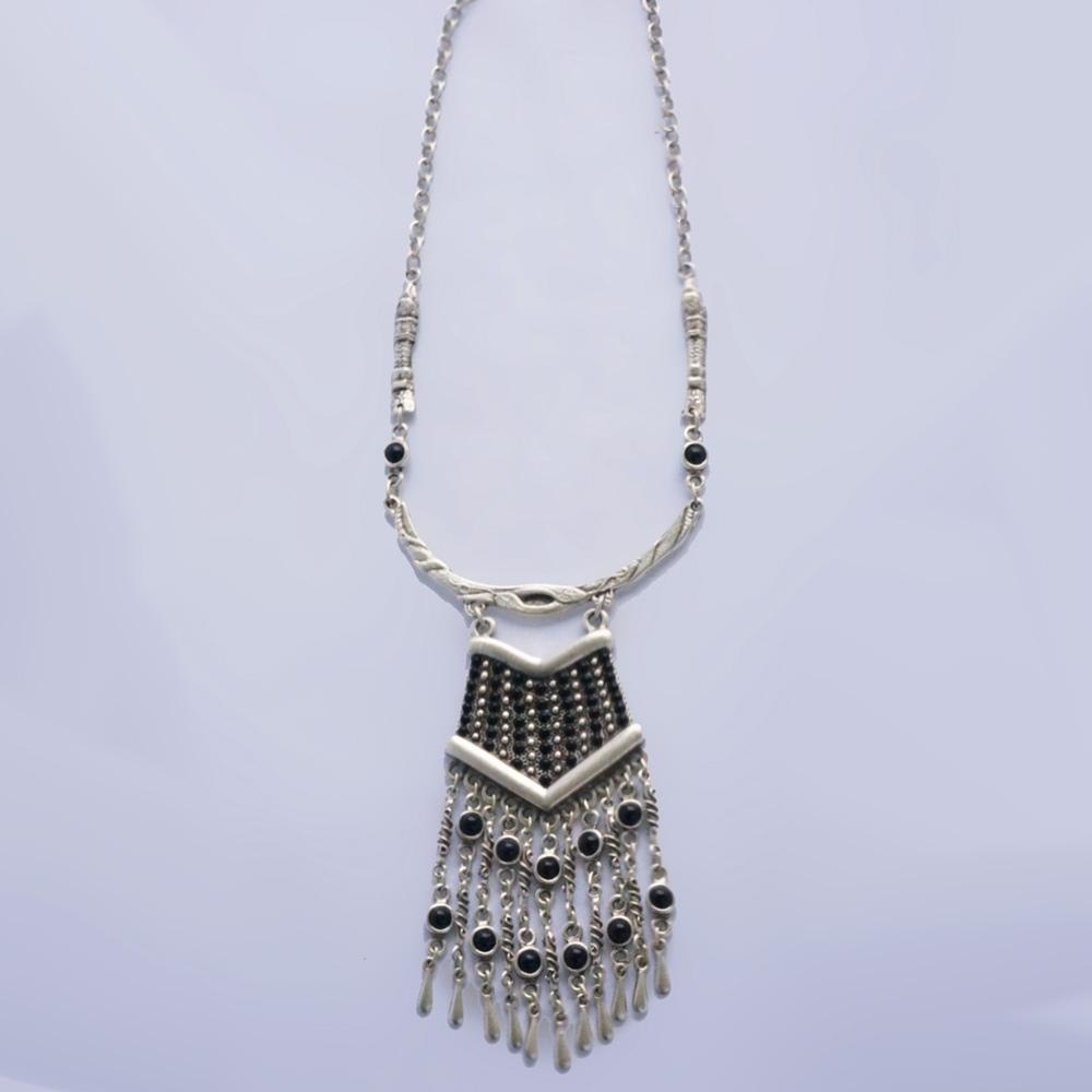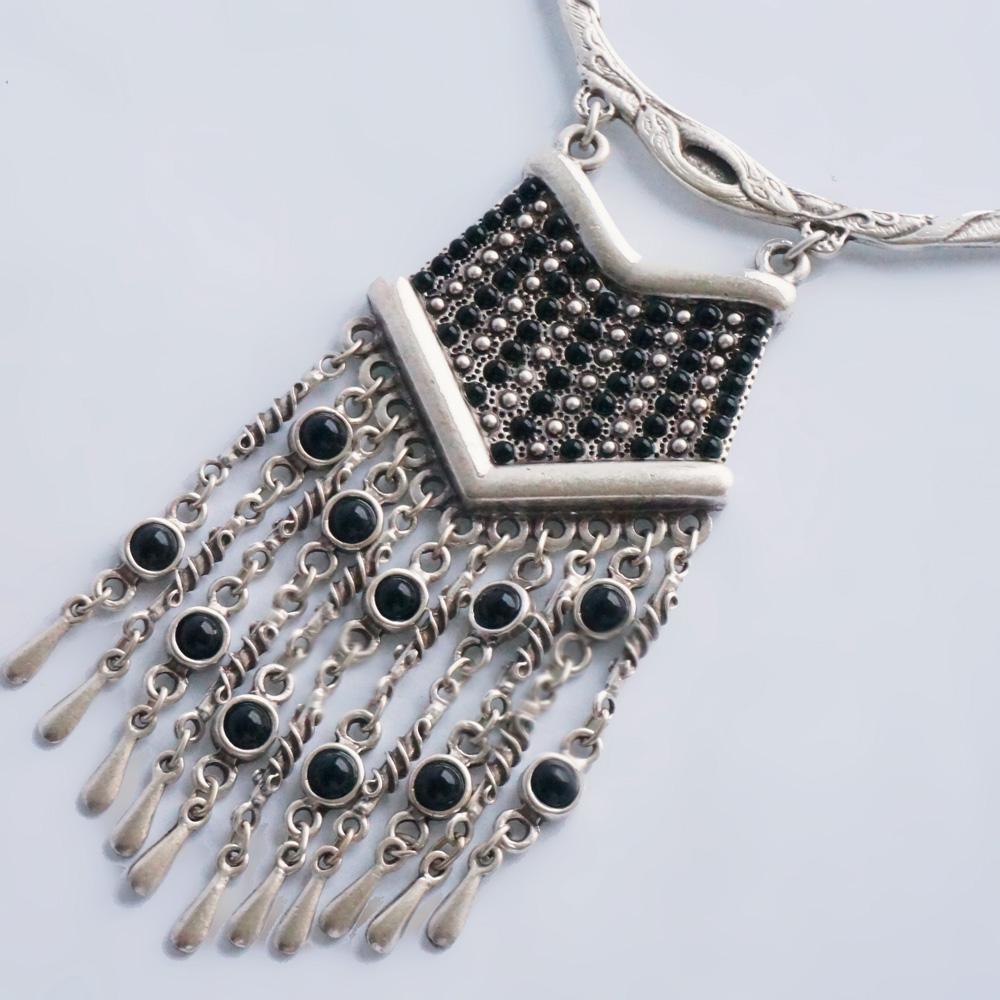 Lucky you! This unique piece is sure to be a conversation starter, with lots of intricate dangling pieces for lots of movement and accented with small polished black onyx stones. Silver plated with adjustable hook and loop closure.
