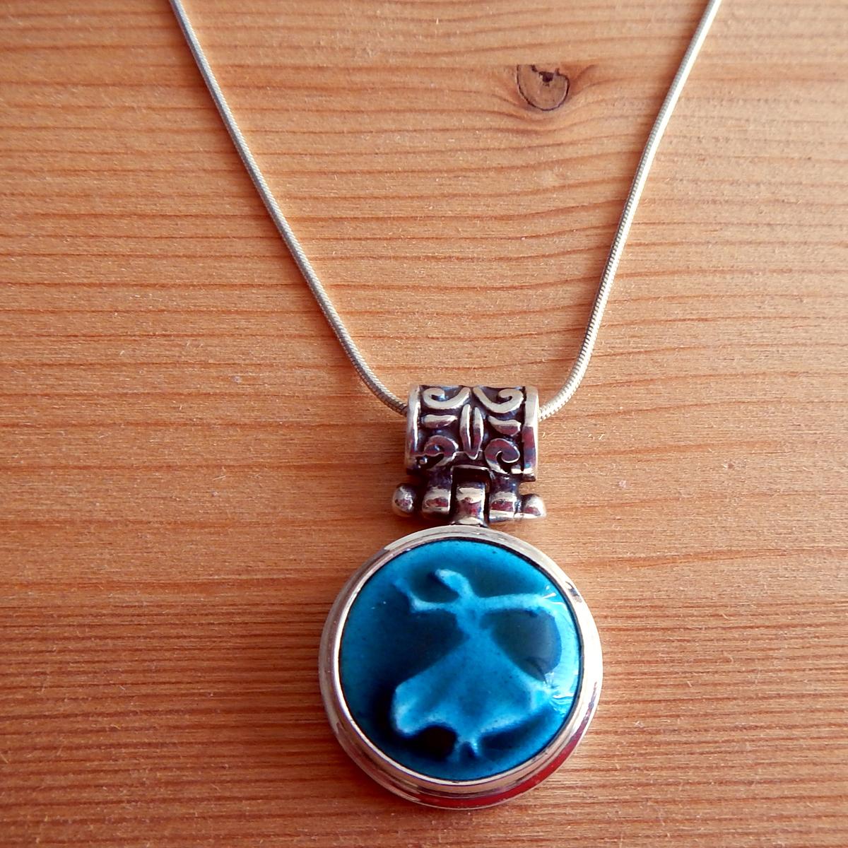 Perfect for Rumi lovers, the Mevlevi necklace features a ceramic pendant depicting a traditional whirling dervish. Housed in a 925 sterling silver setting with ornate scroll detail on slender sterling silver chain.