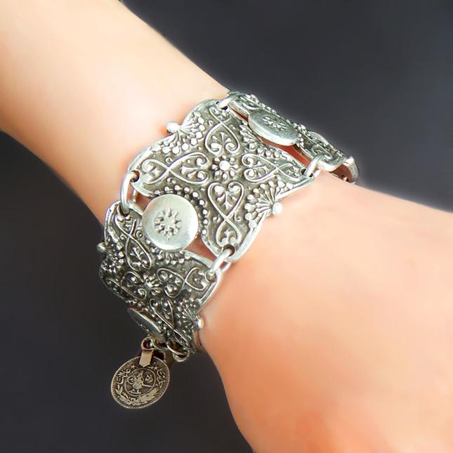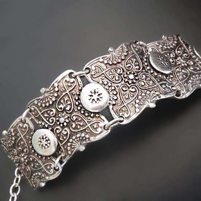 The Odalisque bracelet has stunning vintage flavor, with intricately etched square planes joined together and accented with starburst buttons. Silver-plated with simple hook and loop closure, one size fits all.