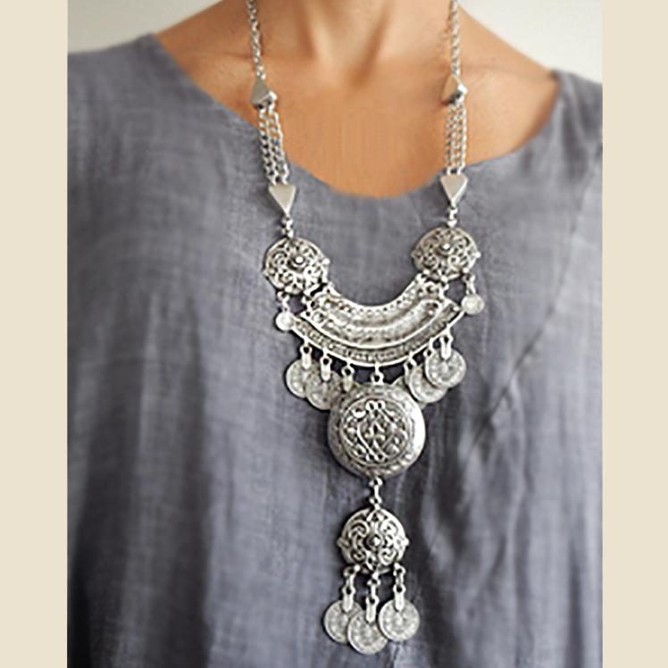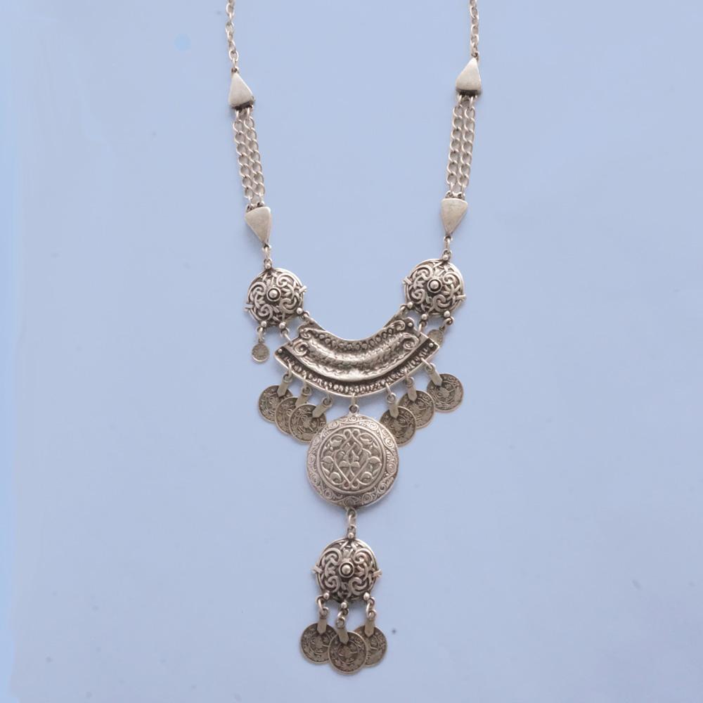 Salome is an elaborate boho-chic piece with intricately-designed dangling pendants and smaller medallions. Silver plated with an adjustable hook and loop closure.