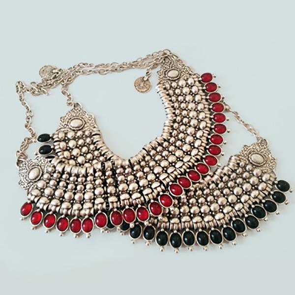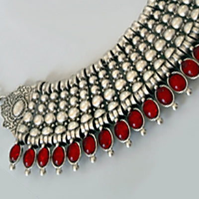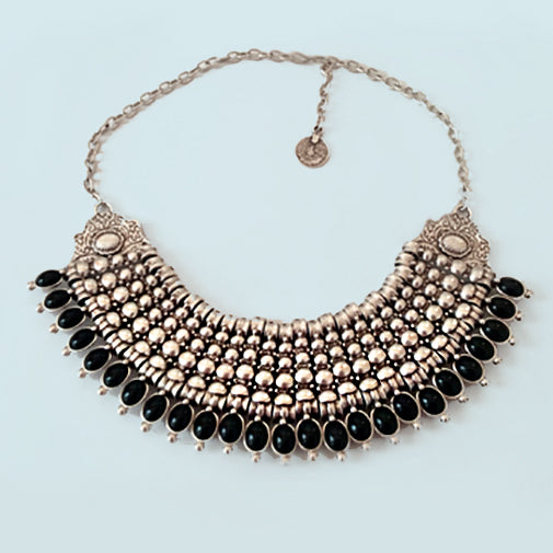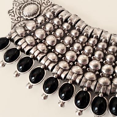 This substantial piece is pure exotic glamour with it's silver-plated collar necklace bordered by polished oval stones. Available in black or red.