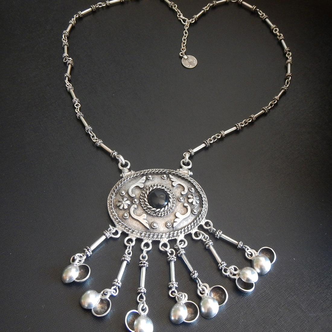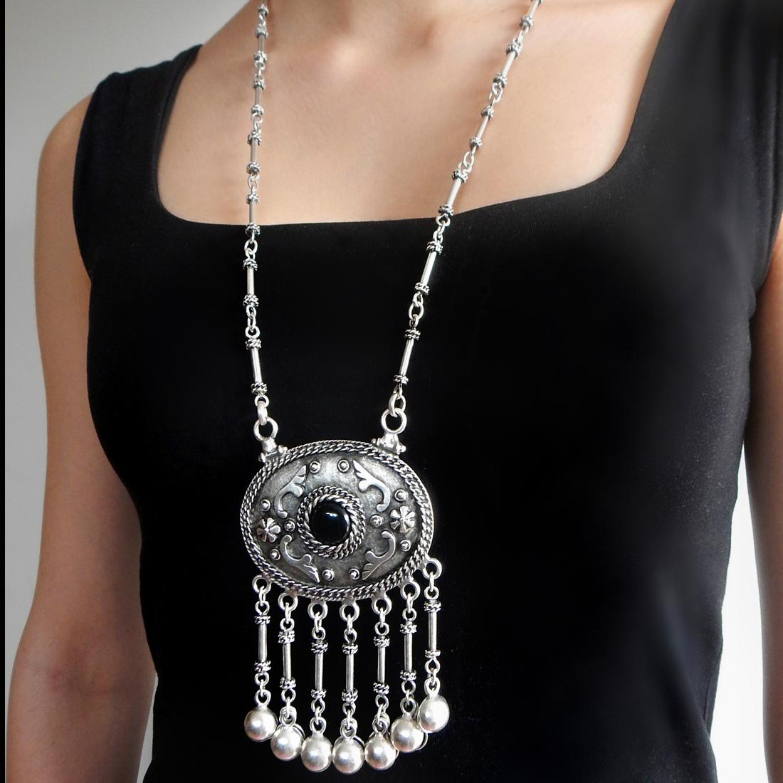 Our Sire necklace is worthy of a queen, featuring a striking design with silver-plated beading and central etched pendant housing a polished black stone.