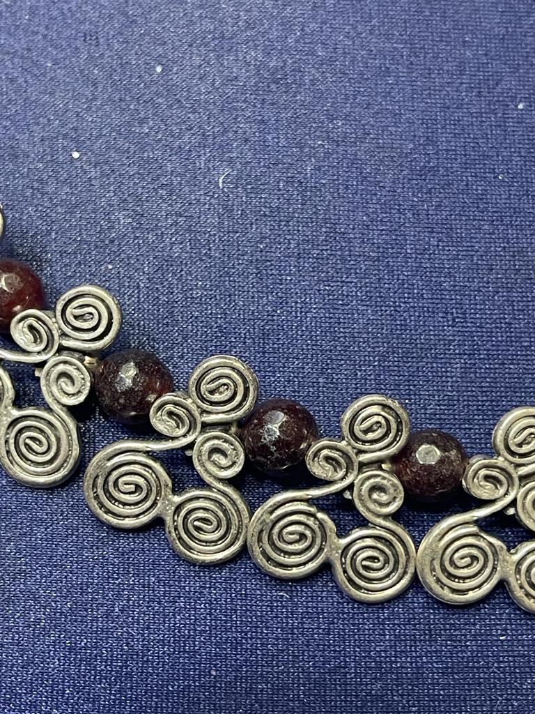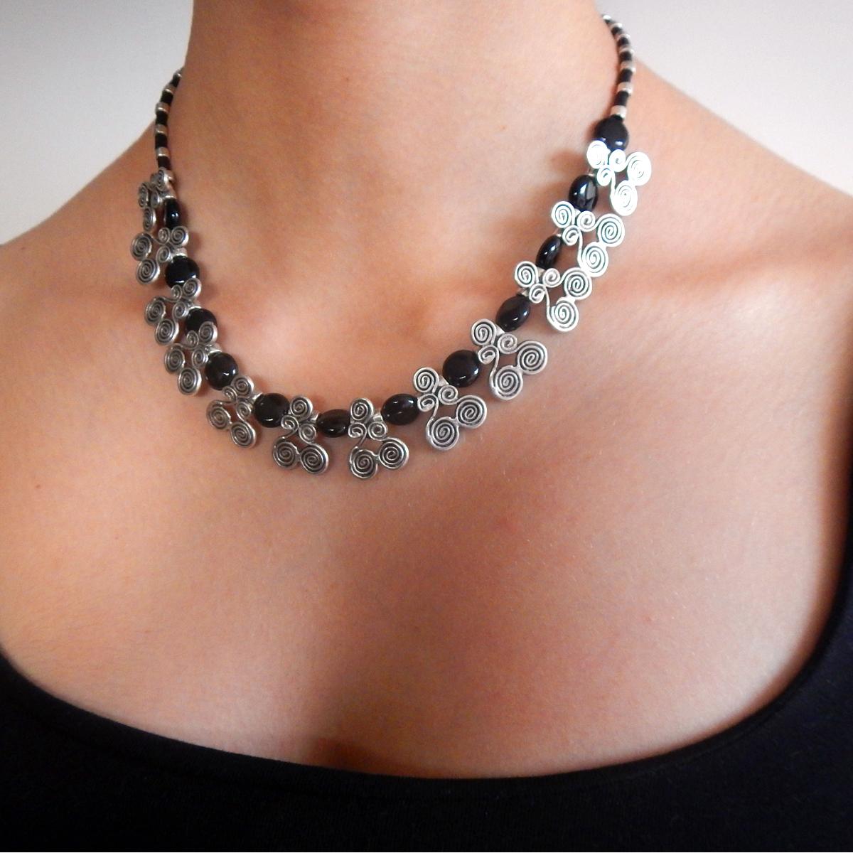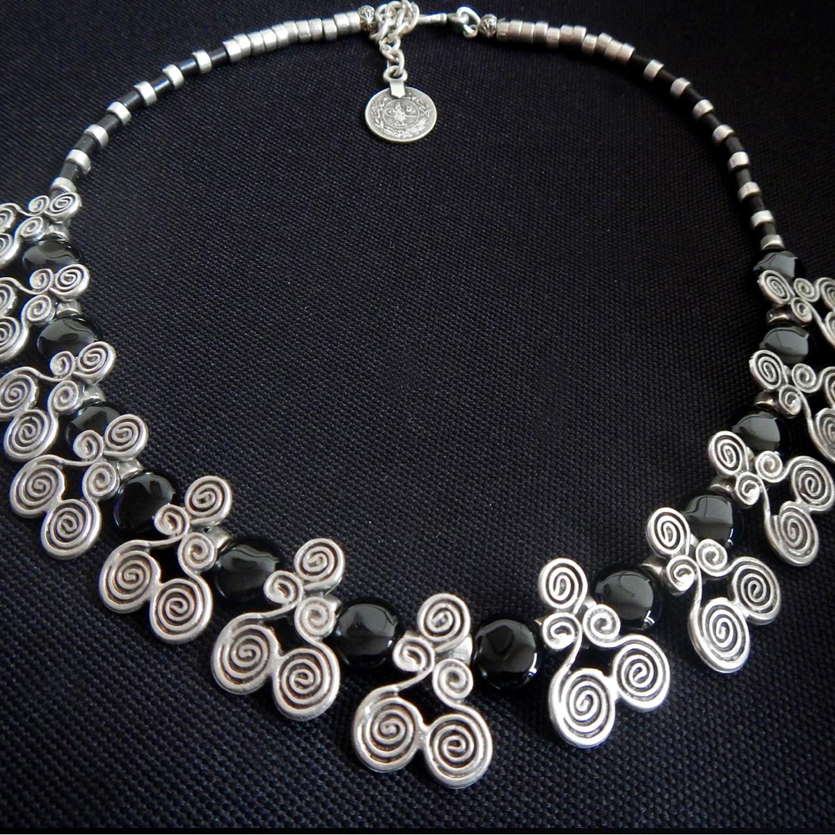 Triskelion builds on the traditional spiral theme, with silver-plated pieces embellished with manmade onyx beads.
