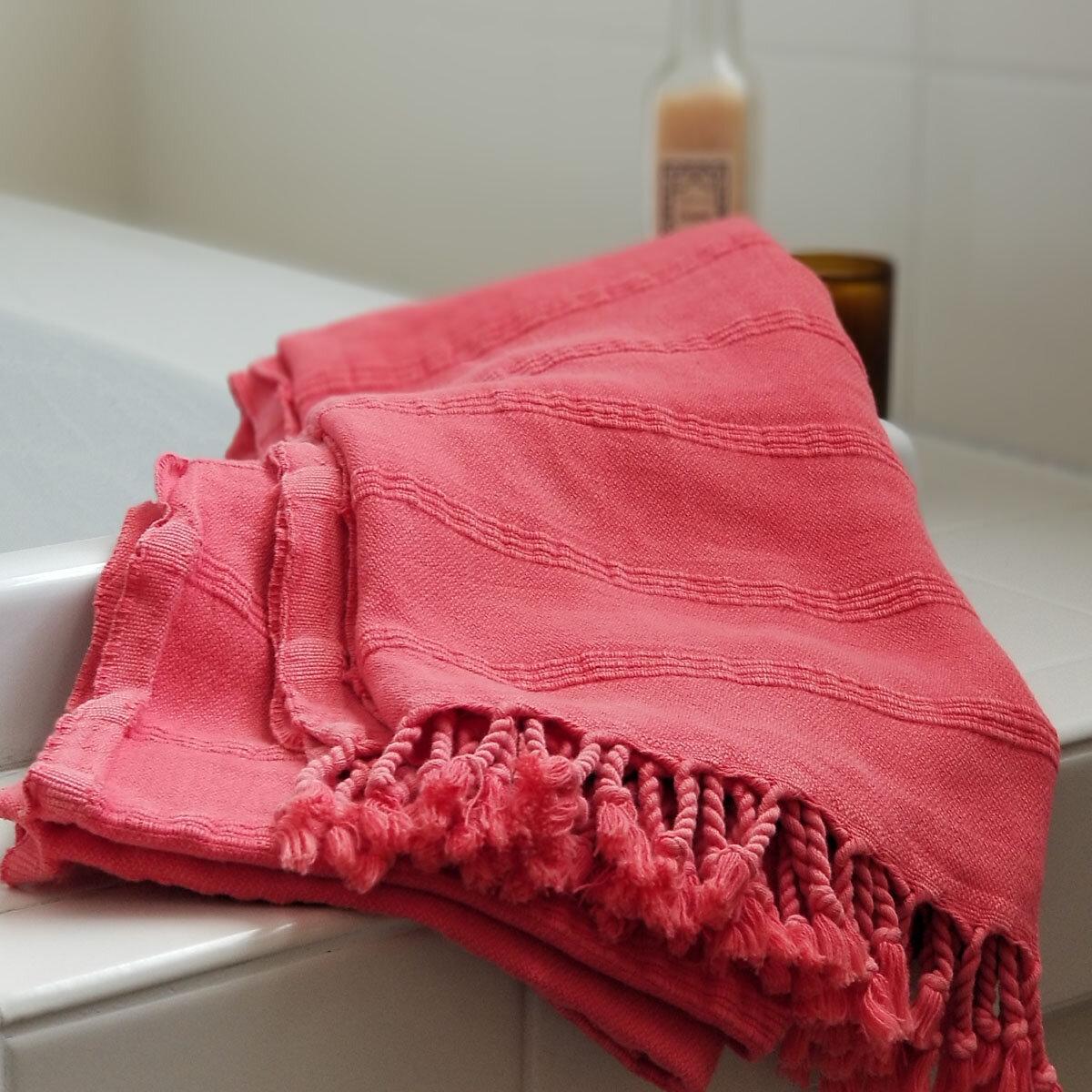 Zeus Pestemal handloomed, vibrant coral color and stone washed for softness. This is one of the softest and absorbent Turkish towel you will ever have.